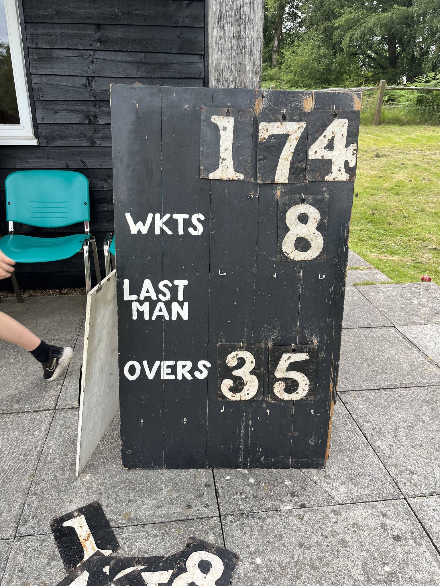 Dover pulled something in his back, on one of his more extravagant efforts, which apparently affected his bowling later on. Pearcey’s arrival at the crease was met with Dickie shouting out, ” Who’s that donkey?”, which apparently referred to a horse that had just ridden past. With some very useful late hitting from Flatliner, we posted a very challenging 174-8.