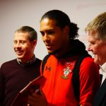 Virgil Van Dijk receives the Mick Strickland Trophy from Charlie Laing and John Middleton after the Middlesbrough game on Sunday December 11th.